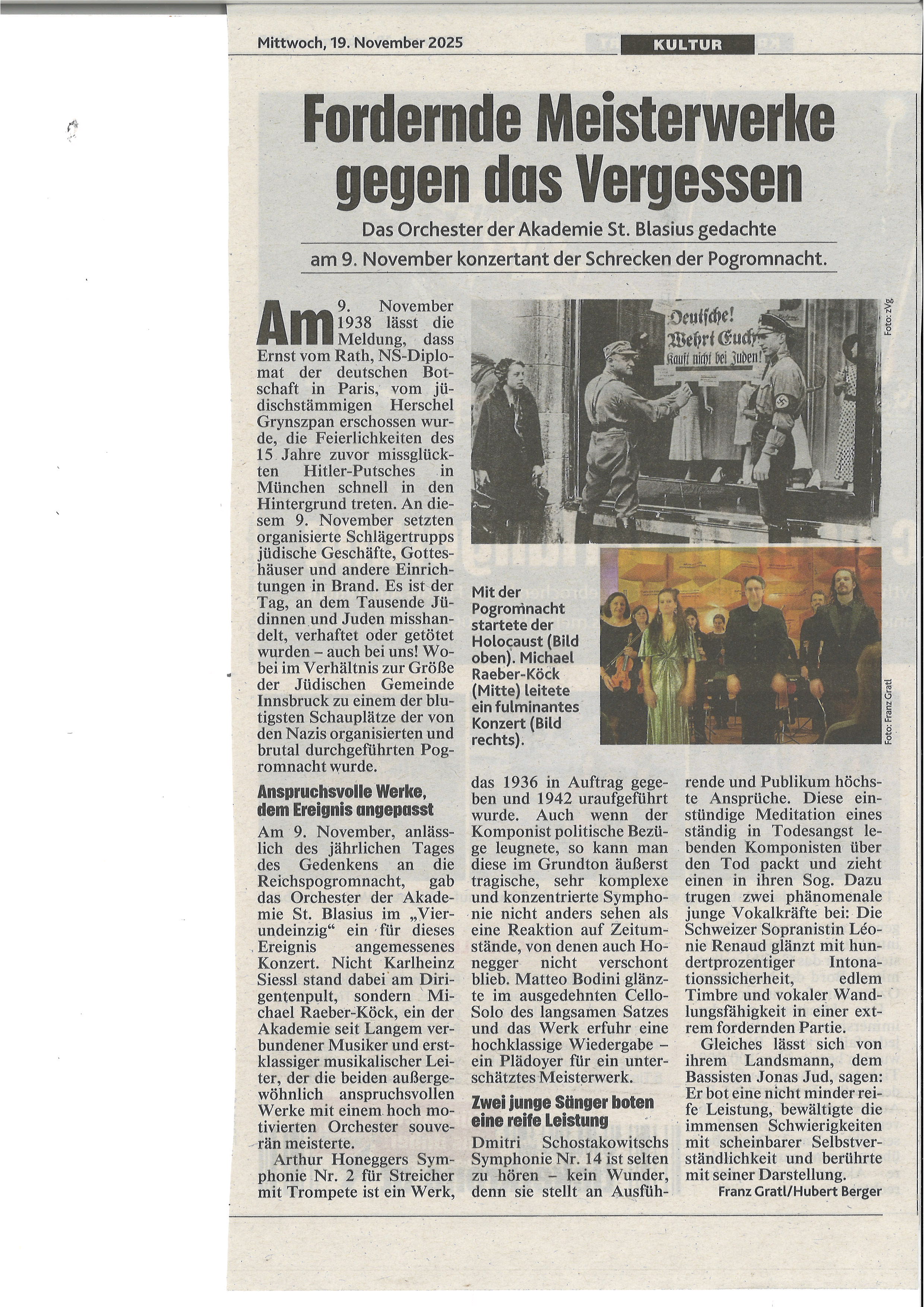 « Mit Léonie Renaud (Sopran) und Jonas Jud (Bass) standen zwei international renommierte Stimmen auf der Bühne. In deutscher Sprache aufgeführt, verlangte das Werk höchste Textsensibilität. Die Sänger*innen zeichneten die elf Sätze mit intensiver Präsenz. Linien von schneidender Klarheit und die existenzielle Schwere, teils radikale Wortwahl der Texte fanden feste Verankerung in der Interpretation. Schostakowitschs Entscheidung, Gedichte von Federico García Lorca, Guillaume Apollinaire, Wilhelm Küchelbecker und Rainer Maria Rilke zu vertonen, wurde nicht nur musikalisch umgesetzt, sondern emotional nachvollziehbar gemacht: Themen wie Gewalt, Unterdrückung, Verlust und der Blick in das Unvermeidbare zwischen Untergang und Auferstehung, durchzogen den Raum. »